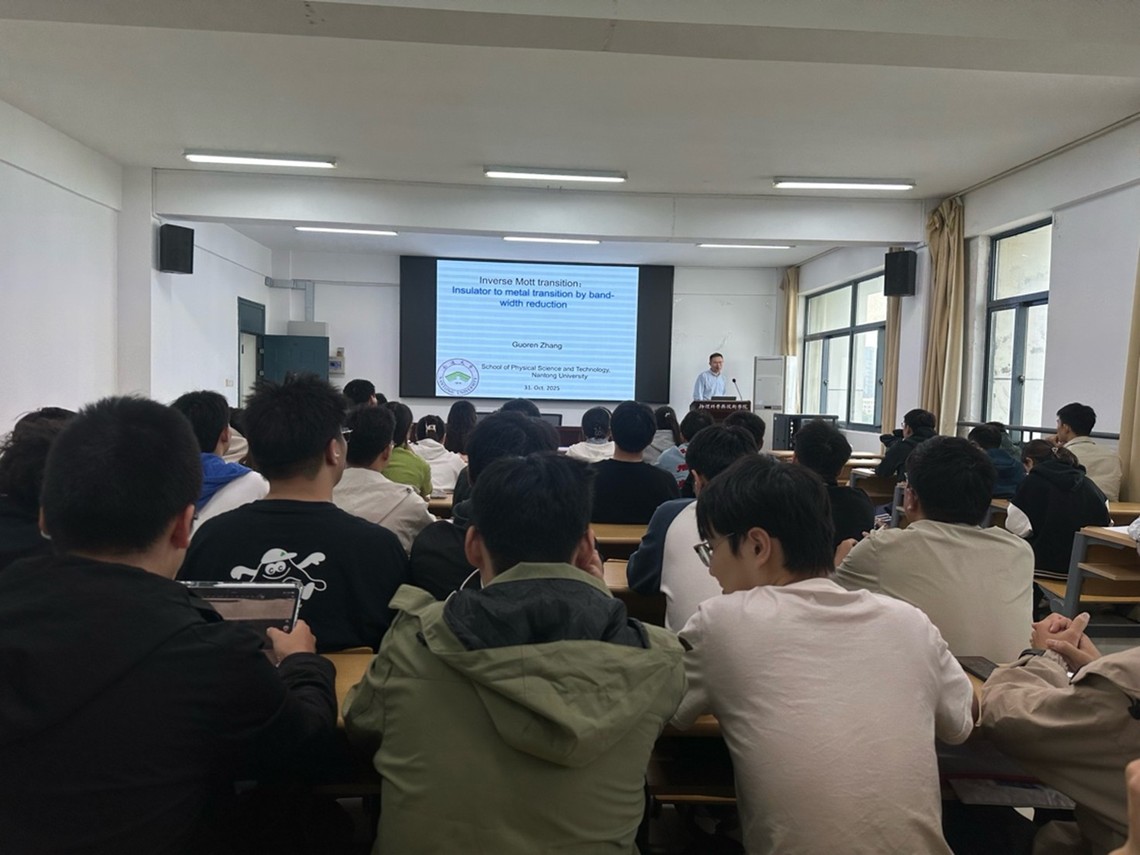 10月31日,我院张国仁教授,应邀出席南通大学第十九届研究生学术论坛暨物理科学与技术学院第一届研究生学术论坛,为我院全体研究生做题为“Inverse Mott transition: Insulator to metal transition by bandwidth reduction”的学术报告。报告会由院长仲崇贵教授主持。