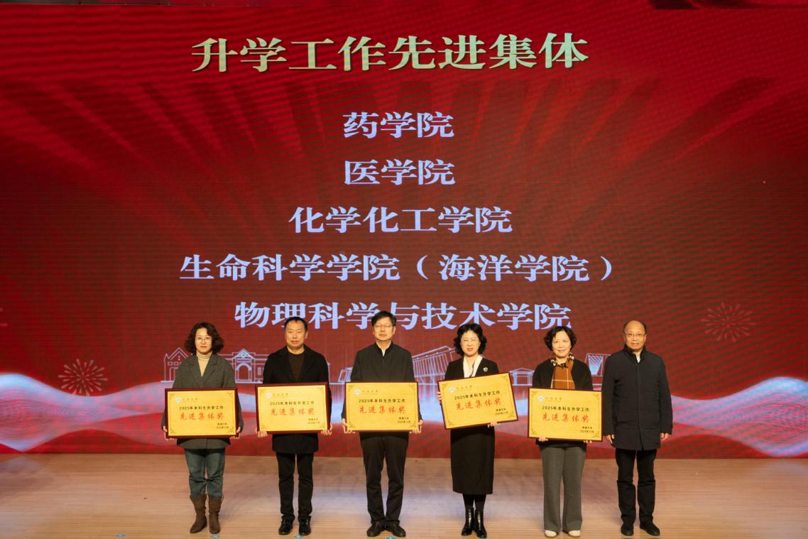 物科院凭借39.86%的升学率实现年度表彰荣誉大满贯。物科院2025 届毕业生 共有153 人,其中 61 人成功升学,30 人被武汉大学、东南大学、西安电子科技大学等双一流建设高校录取,1 人被新加坡国立大学录取,升学质量与数量实现双突破,充分彰显了学院人才培养的扎实成效。一直以来,学院始终将升学工作作为提升人才培养质量的关键抓手,以 “四位工作法” 构建全方位升学支持体系:一是 “合” 字当头,多维协同聚合力。学院将考研工作纳入整体发展规划,成立由书记、院长牵头的考研工作领导小组,构建学院党政领导、系室主任、辅导员、班主任、校友导师、朋辈骨干 “六位一体” 协同机制,形成上下联动、全员参与的升学工作格局;二是 “全” 字为先,厚植全程育人生态。搭建 “教学、管理、服务” 三位一体支撑体系,引导学生从入学之初便树立升学目标,贯穿本科四年开展全程化升学规划指导,实现升学准备的早启动、早规划、早落实;三是 “精” 字为要,靶向突破补短板。大二下学期便通过精准调研,摸清学生升学意向与能力差距,在大二下至大三上关键阶段持续跟进,依托 “六位一体” 协同机制与家校共育模式,精准对接学生需求,最终推动考研报考率达到 69.28%,为高升学率奠定坚实基础;四是 “暖” 字托底,悉心护航有温度。坚持 “严管与厚爱结合,赋能与减压并重” 的工作理念,通过定制化辅导、心理疏导、复试帮扶、资源对接等精准服务提升帮扶实效,营造全员支持、全程助力、全面保障的考研氛围,实现学生应试能力提升与学院育人目标的深度融合。