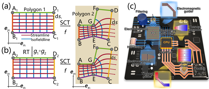 为验证理论的普适性与有效性,研究团队设计并展示了扩展器、引导器及隐身斗篷等多物理场功能器件,成功实现了对热场与电磁场的协同调控。该理论所构建的多边形结构器件与现代印刷电路板上的模块化布局天然兼容,为解决集成电路中热-电磁串扰等实际问题提供了全新途径。