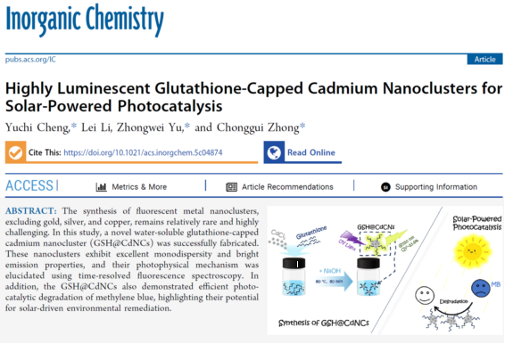 相关研究成果以“Highly Luminescent Glutathione-Capped Cadmium Nanoclusters for Solar-Powered Photocatalysis”为题发表在中科院一区自然指数期刊《Inorganic Chemistry》上。程宇驰博士是论文的第一作者,仲崇贵教授和于忠卫副教授是论文的通讯作者,南通大学物理科学与技术学院为论文第一单位和通讯单位。