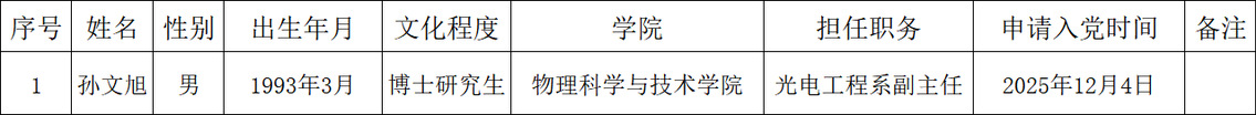 按照《南通大学发展党员工作实施细则》要求,经光电工程系党支部党员大会推荐、支委会研究决定,并报学院党总支委员会讨论通过,拟确定孙文旭为入党积极分子,为发扬民主,广泛听取党内外群众意见,接受广大党员群众监督,现将孙文旭相关情况予以公示(见附表)。